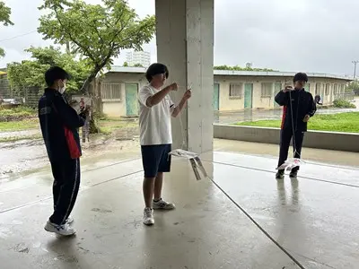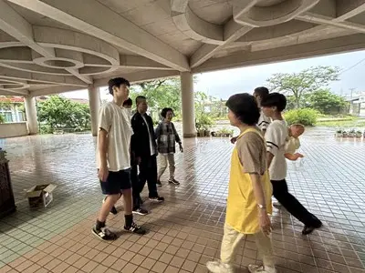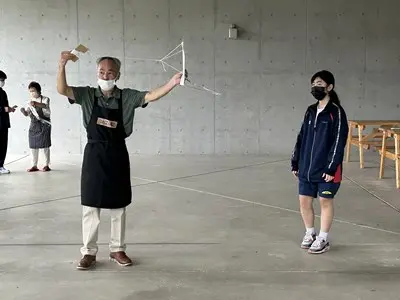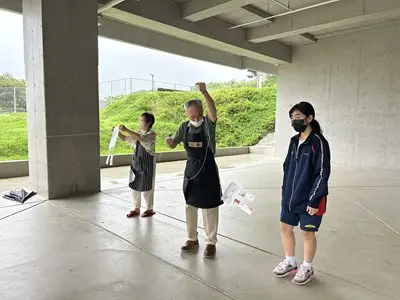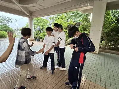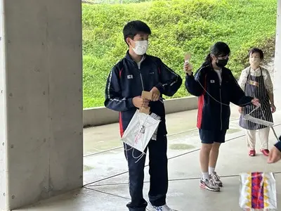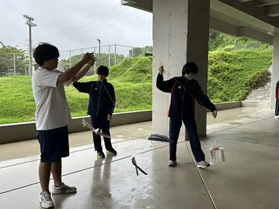 今日は雨の中、2年4組の家庭科の授業に地域の皆さんが協力してくださいました。できた凧は新校舎の軒下で風が吹くのを待って上げました、生徒玄関前では花いちもんめやゴム跳びを習い、アダンの風車は串に刺したらクルクルと回りました。背中におんぶした赤ちゃん人形は思ったよりも重かったようです。「昔は子守をしながらこうやって遊んだのよ」と聞くと、今の子どもの遊びとは全然違うけれど手作りで工夫して遊んでいたのだなと実感する4組さんでした。