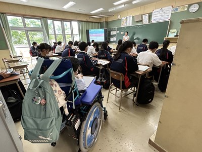 鏡ヶ丘特別支援学校の中学部の生徒さんが本校の3年4組で共に授業を受ける交流学習が行われました。3時間という限られた時間でしたが、本校の生徒にとっても貴重な経験になればと思いました。一回は会話してみてとそばにいた男子生徒に伝えたらすぐに話しかけている様子が見えました。「一緒に授業を受けることができてとても楽しかったです!」と校長室で本人の感想ももらいました。次はテストを実際に受験する交流と12月にはボッチャ競技交流が計画されています。相互理解につながるようこれからも多くの関りが持てたらいいですね。「鏡ヶ丘で流行っているキツネポーズ」を教えてもらい記念撮影しました!