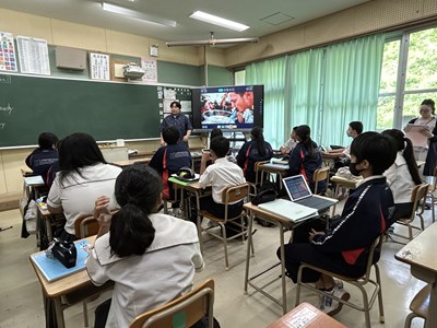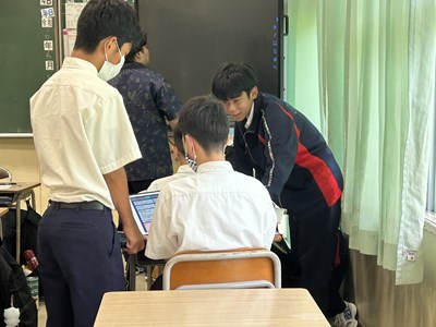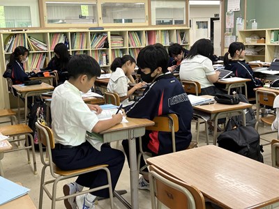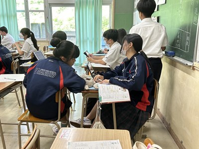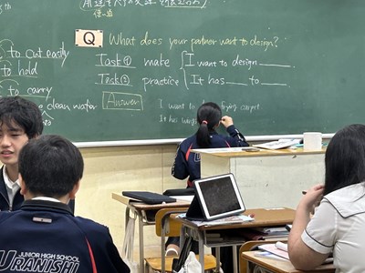 當間颯太先生による英語の研究授業が2年3組で行われました。自分が作りたいウェルデザインの用途をペアで伝え合う授業でした。3組さんが何をデザインしたいのか聞いてみたら「物を無限に入れられるバッグ」や「すぐ乾くドライヤー」「異星間ロケット」「どこでもドア」など実用的な物から発明品のような物までありました。「~のための機能」というところを説明し合えるよう一生懸命英作文している様子がありました。