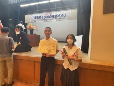 去る6月28日に、ハーモニーセンターにおいて第37回浦添市少年の主張大会が開催されました。本校から代表3年生2名が出場し、諸見さんは「本気の証」、堀川さんが「生きやすい社会をつくるためには」の演題で、自身の体験を通した素晴らしい発表をしてくれました。結果は諸見さんが優秀賞、堀川さんが優良賞を受賞しました。優秀賞の諸見さんは那覇地区大会に浦添市の代表として出場することが決定しました。2人ともよく頑張りました。国語科の先生方、ご指導ありがとうございました!
