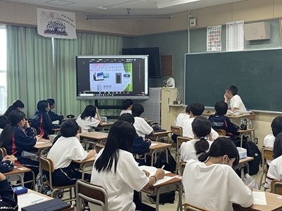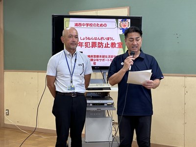夏休みを前に、本校では県警察本部少年課から大山哲警部補を講師にお招きし、「少年犯罪防止教室」を実施しました。本部会場の被服室から各教室をつないでの実施でしたが、メモを取りながらしっかりと講話を聴くことができていました。深夜徘徊や飲酒・喫煙・闇バイト・SNSでの誹謗中傷など、中学生を取り巻く様々な危険な行為から自分の身をいかに守るか、犯罪にかかわらないようにするためにも、想像力やイメージする力、見通す力をしっかりと身に付けて日々防止に努めていきましょう。