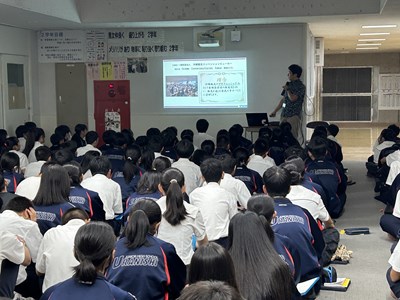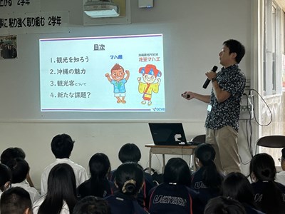 2学年の総合で、ハッピートラベルプロジェクトガイダンスが行われています。沖縄コンベンションビューローの田野さんを講師にお招きし、「沖縄観光の現在と未来」について、講話をしていただきました。事前に2年生の皆さんが沖縄の観光課題や成長性がありそうなところを考えてくれていますが、今日の講話内容から、自分たちの探究課題の設定にどんどん役立ててほしいです。