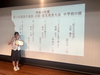 公開日 2024年10月11日 本日、第49回浦添市意見発表大会が行われ、3年生の新垣七海さんが最優秀賞を受賞しました。「おめでとうございます!」七海さんは11月に行われる那覇地区大会に出場します。みんなで応援しましょう!