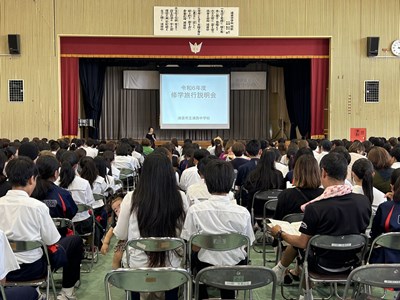 本日午後、2年生の生徒、保護者を対象に令和6年度の修学旅行説明会が行われました。体育館はとても暑かったのですが、最後までしっかりと説明を聞いて下さりありがとうございます。思い出いっぱいの修学旅行になるよう、ご家庭での健康管理や持ち物の準備等、ぜひご協力よろしくお願いします。