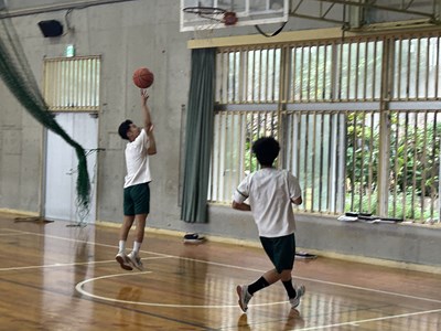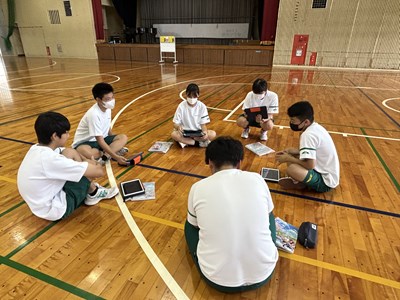 体育の授業でバスケットボールに取り組んでいる3年5組の授業を参観しました。体育館を広々と使用して、のびのびと楽しそうに活動しています。3対3のゲームを通してチームの課題を見つけて解決策を考える授業でした。男子と女子が協力してゲームを楽しんでいる様子を見ることができました。
