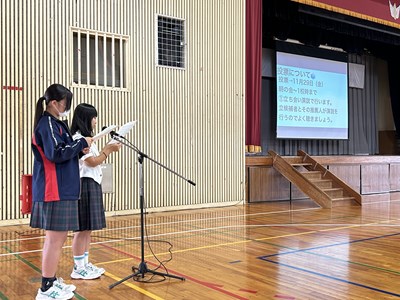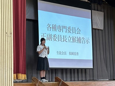 生徒会朝会では、11月29日に実施される生徒会長選挙に向けて説明が行われました。今年度2年生から生徒会長立候補者が8名、1年生から副会長立候補者が4名です。呼名されると元気に返事をしてくれました。浦西中学校を自分たちの手でよりよくしようと立ち上がった意欲のある皆さんです。これから選挙活動が始まります。候補者のポスターが生徒玄関前に設置されています。選挙管理委員会からは注意事項も提示されました。みんなで公正で公平な選挙に向けて取り組んでいきましょう。