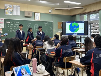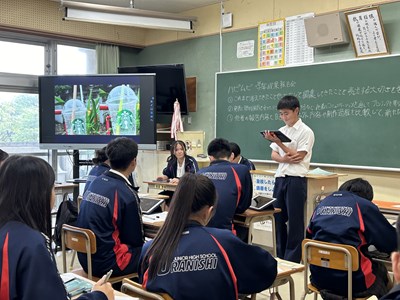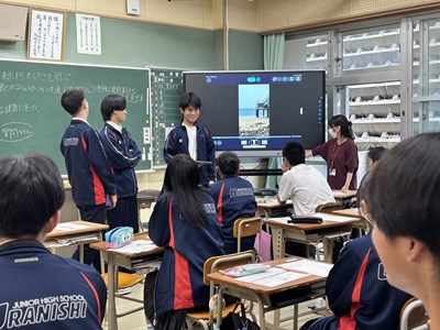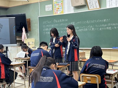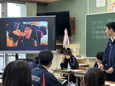 3年生のプロジェクト型探究活動で15秒の動画制作を行いました。世の中の様々なターゲットの課題を解決する動画(CM)を制作した3年生、15秒という短い時間でメッセージを伝えることができるでしょうか。ターゲットをハッピーにするだけではなく、動画を見た人がもしかしたら気持ちや行動が変化するきっかけになるかもしれません。お互いの発表を聞いて質問リストを参考に質疑応答を行いました。中学生ならではのセンスが活かされる作品もあり、見ていてとても楽しいです。この経験から、世の中のあらゆる場面で作り手の意図やメッセージがあることに気づける人に近づいたような気がします。