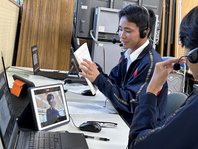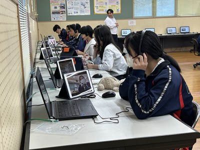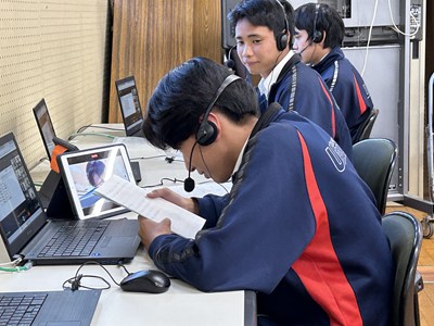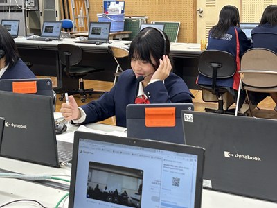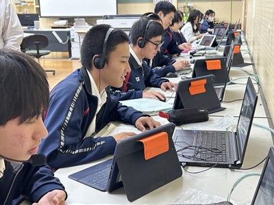 先週、文科省調査官招聘の英語の授業を行った3年2組の皆さんが、コンピュータ教室にてオンラインで台湾の中学生と意見交換を行いました。ヘッドセットを付けてグループチャットで、これまでの授業で取り組んできた「働きがい」や「理想の働き方」ついて将来の自分をイメージしながらお互いに英語で意見を交換しました。自分の話している様子はタブレットで動画を撮りパフォーマンステストとしています。少し緊張しながらも、伝える相手が海外にいることで、楽しそうにコミュニケーションを図ろうとする様子がうかがえました。