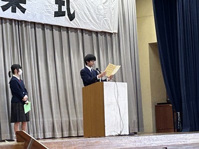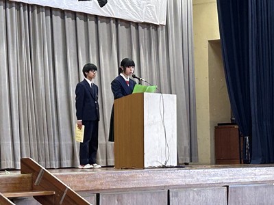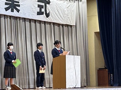 本日午後、二学期の終業式を行いました。各学年生徒代表が長い二学期を振り返り、自分たちの学年の成長や三学期に向けての抱負を語ってくれました。頼もしい代表あいさつでした。一番長い二学期も今日で終わります。今年もたくさんの生徒の笑顔に出会えました。2025年も、浦西中生の元気な姿をご紹介します。