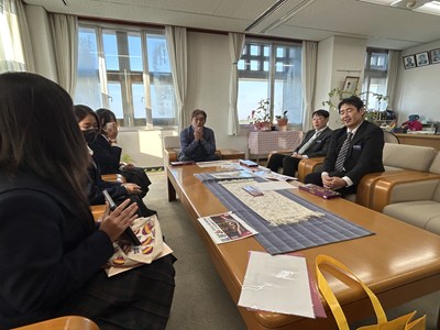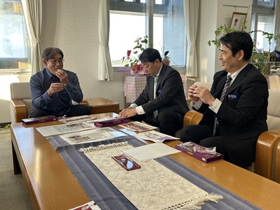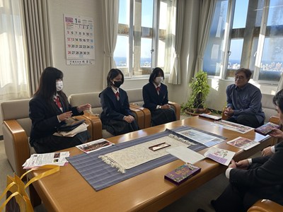 「紅芋ム~チもなか」発売を受けて、浦添市教育委員会銘苅健教育長を表敬訪問しました。商品企画ができあがるまでの道のりを詳しく楽しくプレゼンし、銘苅教育長、内田部長、照屋係長からのたくさんの質問にお答えしました。商品の魅力を存分にお伝えすることができた久高さん、儀部さん、仲宗根さん3名は口々に「とても楽しい時間だった」と嬉しそうです。最後は「ム~チベーション」を上げて夢に向かって頑張っていこう!と合言葉も出てきました。お忙しい中浦西中生徒を激励していただき心から感謝いたします。