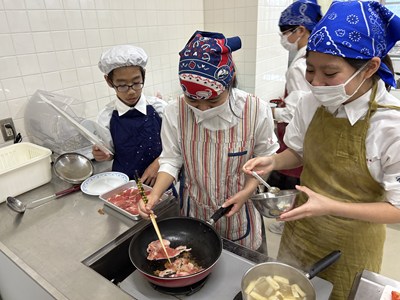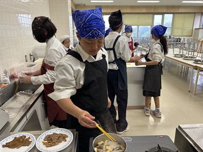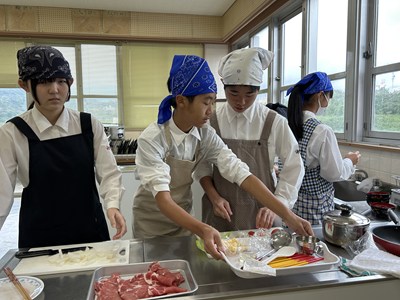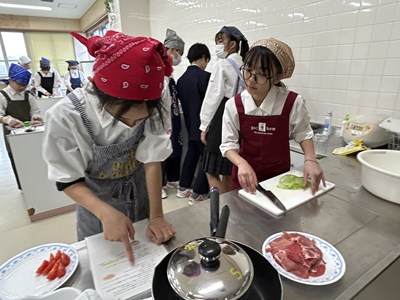 1年生の調理実習が始まっています。1・2校時に5組さんが実習しているところを見学しました。メニューは豚肉のしょうが焼きと大根と油揚げの味噌汁、ごはんです。グループで分担して声をかけあって楽しそうに作業していました。たれをからめながら上手に肉を焼いていい匂いがしていましたよ。ぜひ家でもしょうが焼きを作って家族にごちそうする機会があったらいいですね。