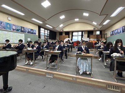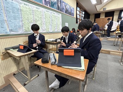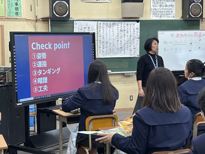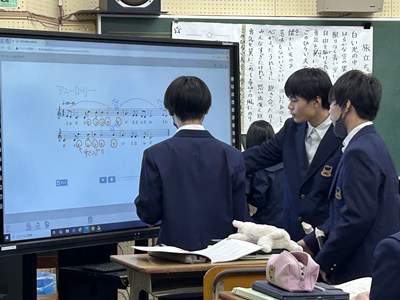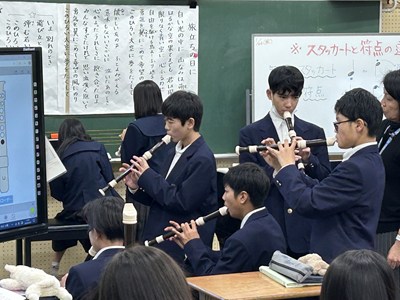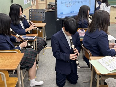 27日3校時に、新垣亜紀先生の音楽の研究授業がありました。アルトリコーダーで「アニーローリー」をどのように演奏したいかを自分で決めて個人やグループで練習をする授業でした。電子黒板で運指を確かめたり、なめらかに演奏できるようブレスに気を付けたり自分たちで考えながら練習をする姿がありました。授業の始めと最後ではかなり上達していた1組さんです。来週のリコーダーのテストみんな頑張ってくださいね。
