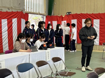 卒業式に向けての会場設営と入退場のリハーサルを行っています。3年生の思い出に残る卒業式にしようと、それぞれの役割を担って頑張っています!