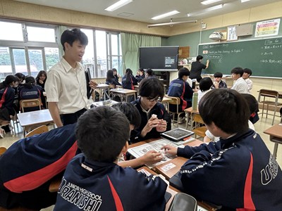 2年2組の英語の授業で楽しそうにサイコロトーキングで質問に答える授業を行っていました。遠足のグループにわかれてサイコロの目が出ただけ進みそのコマにある質問に一文をプラスして答えます。「会いたい人は誰?」や「好きな歌は何?」など、理由も一緒にプラスワンで答えながら英語でのコミュニケーションが楽しくなりますね。