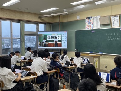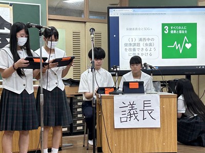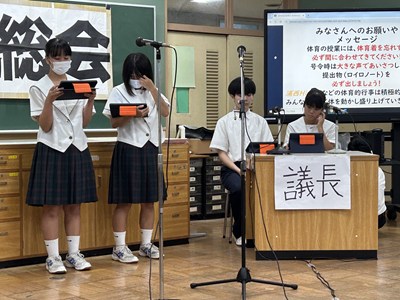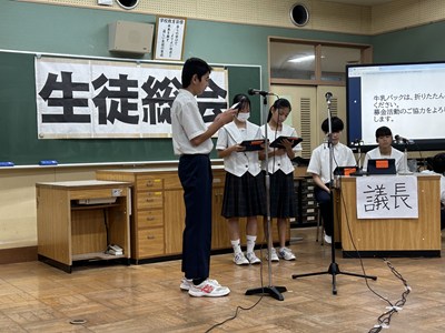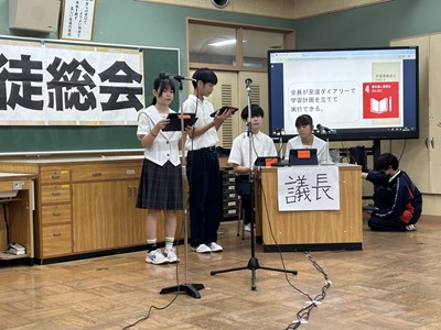 令和7年度の生徒総会が行われました。本会場と各学級をオンラインでつなぎ、全校生徒が参加しました。「文武両道の花咲く浦西中」をスローガンに掲げ、本校の生徒会活動はとても活発に行われています。今年度は活動目標に「学校や地域に参加することを喜びにできる最幸の浦西人~Let'sウェルビーイング~」と設定し、中央委員会、専門委員会の活動計画にもウェルビーイングの視点、SDGsの視点がちりばめられていました。浦西中生一人一人が生徒会員という自覚を持ち、これからますます活動を通して学校や地域へ貢献することを願っています!