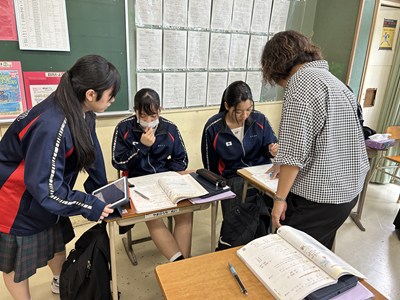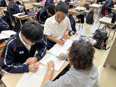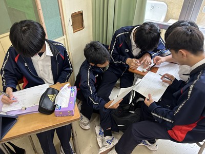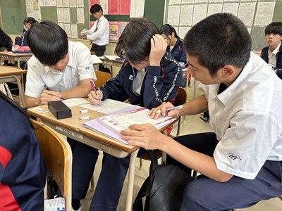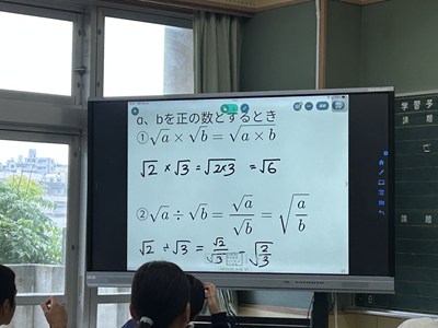 3年4組で眞榮城亜矢子先生による数学の研究授業が行われました。根号のついた数を変形する問題に挑戦する授業でした。事前課題で解答した例が紹介されたあと、今日の課題のプリントにそれぞれ取り組みました。ルートの中が一番小さな自然数になるまで、全員が教え合い、学び合う姿が印象的でした。最後の5分は確認テストが行われ、全員がロイロで提出しています。わからないままにしない地道に学ぶ姿はさすが3年生です。