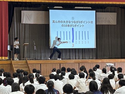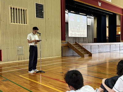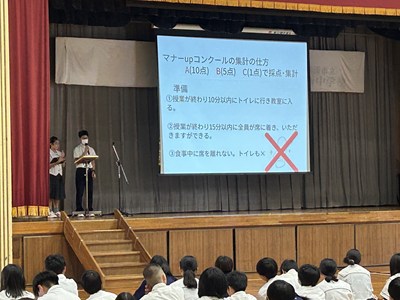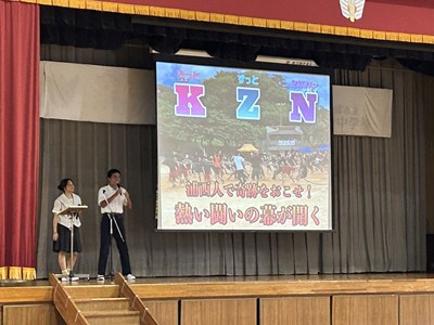 今朝は生徒会朝会がありました。保健委員会からは、浦西中生徒の虫歯率が沖縄県の2倍であること、虫歯の予防と治療の呼びかけ、各団で治療完了率を競うことが報告されました。給食委員会からはマナーUPコンクールについての説明が行われました。生徒会三役からは「KZNプロジェクト」の動画紹介の後、11色綱引きについての解説がありました。生徒会活動が活性化するとともに、相手意識で伝える生徒の皆さんのプレゼン力も上がってきましたね!