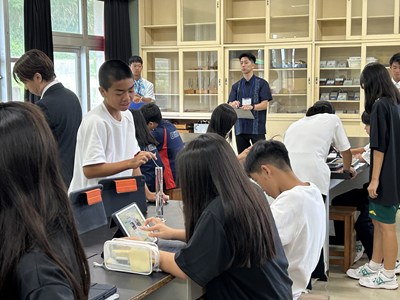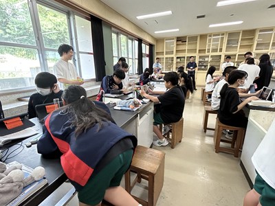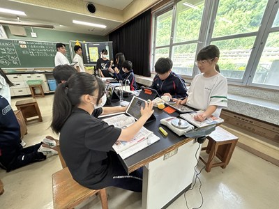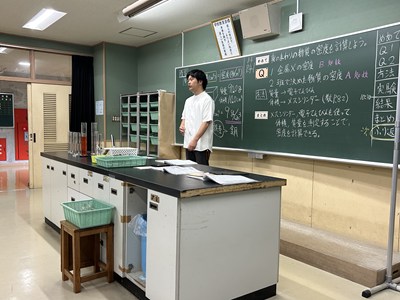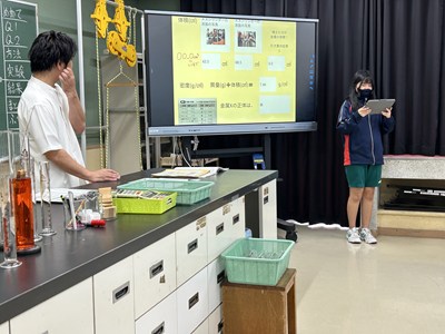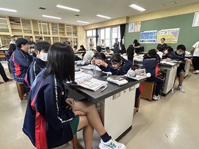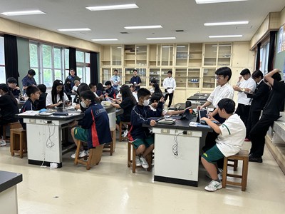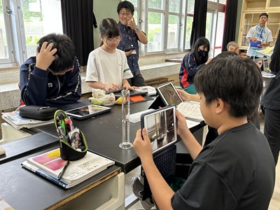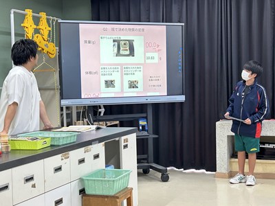 1年4組の森平先生の理科の授業を文科省の調査官の先生方が参観されました。身のまわりの物質の密度を計算して求める授業で、質量や体積を自分たちで調べていました。多くの先生方が参観する中、いつも通りのペースで頑張る4組でした。
