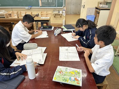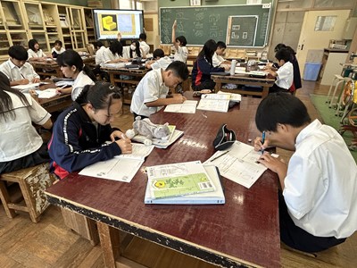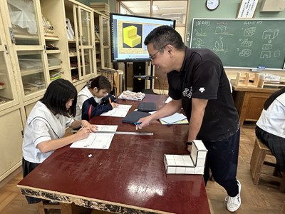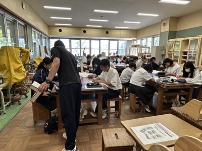1年3組の技術の授業では、作品製作に必要な製図について学んでいました。第三角法で立体を表すことに挑戦して、義幸先生が一人ずつできているかを確認していました。図面を正確にひくことが、木工作品製作には欠かせませんね。今日の課題をみんなでクリアしましょう!