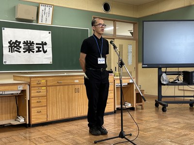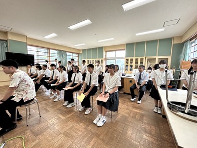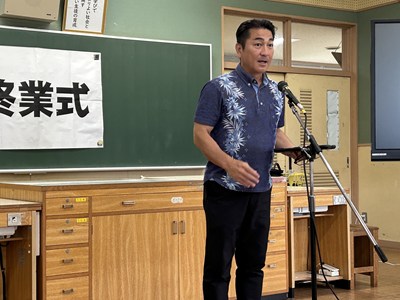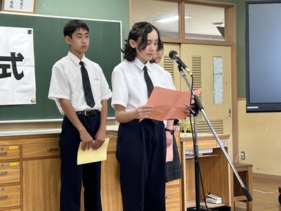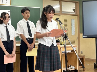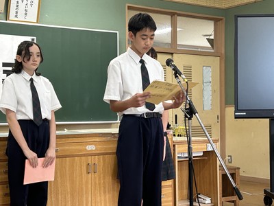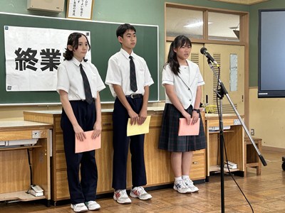 本日、一学期の終業式がオンラインで各学年フロアをつないで執り行われました。本会場の被服室には、生徒会総務、放送委員、各学年生徒代表、県夏季総体に出場する部活のキャプテンが出席しました。生徒代表のあいさつでは、1学期に行われた行事の思い出や、級長、副級長としての成長、2学期に向けての決意が語られました。式が終了して、本校を離任する新里隆則先生からあいさつをいただきました。また、生徒指導の小波津先生から、夏休み期間の過ごし方について、お話がありました。しっかりとした聴く態度でみんな臨んでくれました。長い夏休みを有意義に過ごしましょう。そして元気な笑顔で2学期に再会しましょうね!