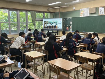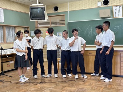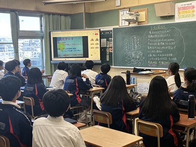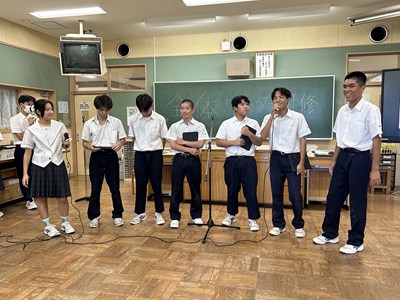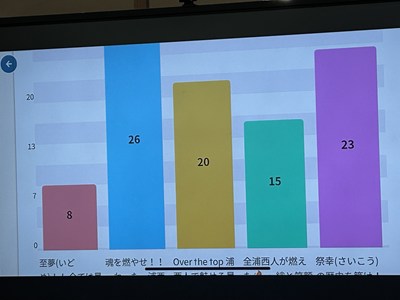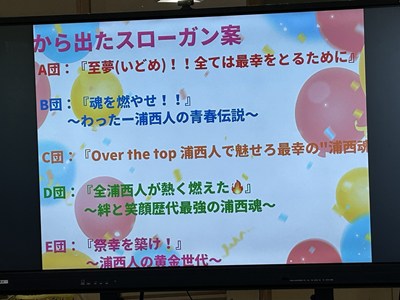 本日4校時は、夏休みのリーダー研修報告と浦西High祭のスローガンを決定する「全体リーダー研修会」が行われました。生徒会長・副会長のMCで、各団団長の団パフォコンセプト案、High祭スローガン案が発表されると、各教室から全校生徒が投票を行い、即時スローガンが決定しました!最終的には僅差でE団を抑え、B団考案の「『魂を燃やせ!!』~わったー浦西人の青春(アオハル)伝説~」に決定です!スローガンも決まってこれからますます盛り上がっていきます!