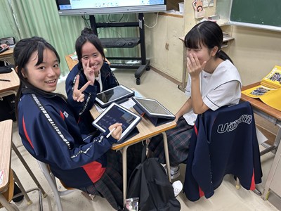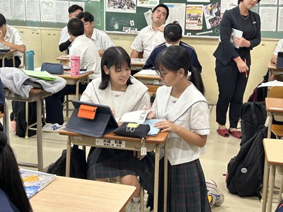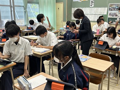 この授業では何を頑張ったらいいのかしっかりと理解して主体的に取り組む生徒の姿が多く見られます。私が席を回っていたら「校長先生、これ昨日の授業なんですけど面白くないですか?」と、タブレットの中にある前時に取り組んだカードを自信たっぷりに見せてくれました。授業の中の「問い」そのものを面白いと感じることができた瞬間に、その学びは自分事となるんですね。浦西中生は今日も頑張っています!
