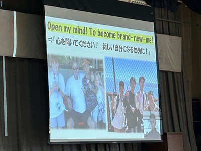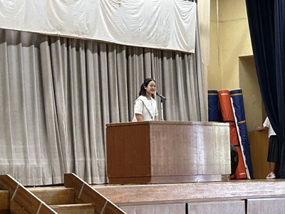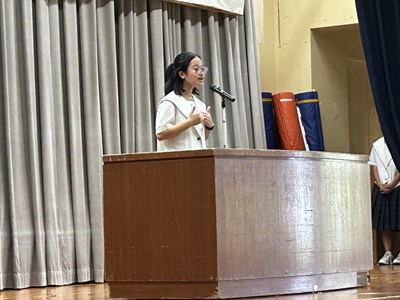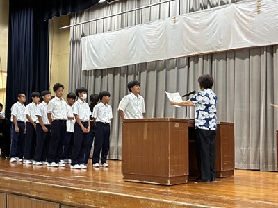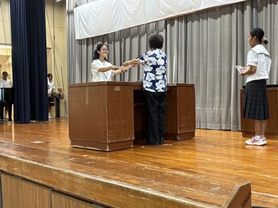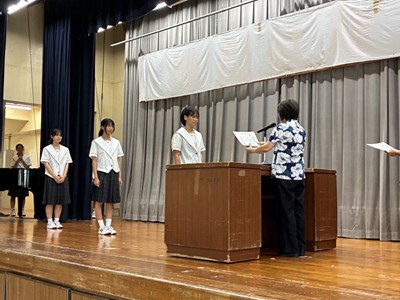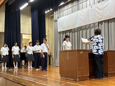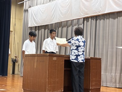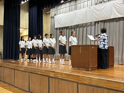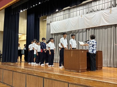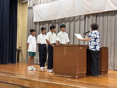 本日の朝会は各表彰と、太陽っ子短期留学派遣事業でアメリカに留学した1年生宮平さんによる報告と、高円宮杯英語弁論大会の県大会に出場する3年生玉那覇さんの発表が行われました。本日の表彰は以下の皆さんです。おめでとうございます。