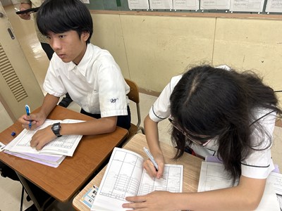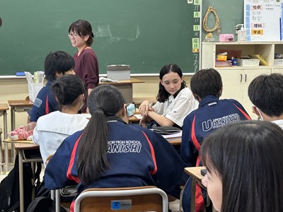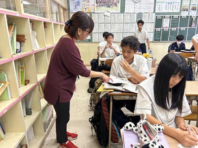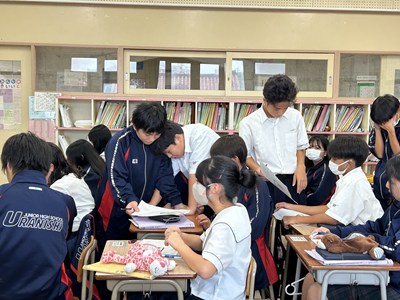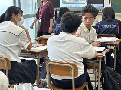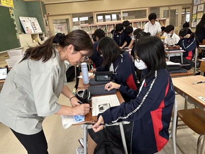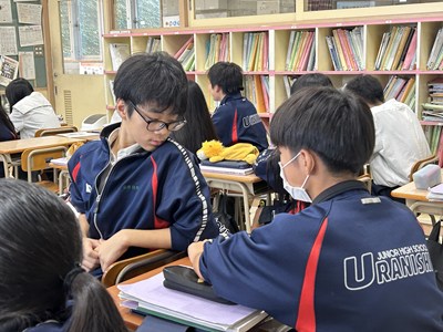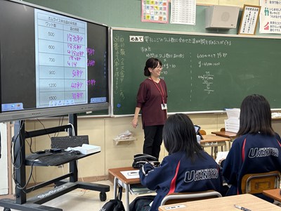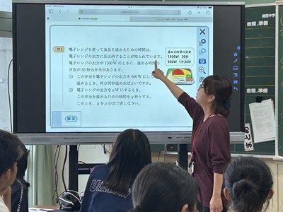 先生方の研究授業が毎日続いています。生徒も頑張っていますが先生方も日々研鑽を積んでいます!今日は1年5組で大城育美先生の数学の研究授業が行われました。市販のお弁当の電子レンジの温め時間とワット数に着目しました。二組の数値に規則性は見いだせるかについて、反比例になりそうだという意見が出て、みんなで比例定数を求め計算した後、一人一人のお弁当でレポート作成にうつりました。全員ができたところまでロイロで提出して身近な生活の中の数学について考える機会となりましたね。提出日や単元テストの連絡を、ダイアリーに書き込む姿も見られました。