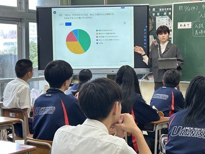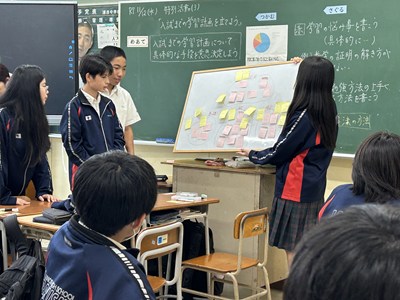 本日、3年4組において川満美智子先生による学級活動の研究授業が行われました。これまでの学習の問題点と悩みの解決を通して、入試に向けて学習計画を立てようという授業でした。学級の空気も温かく、グループで仲良く悩み事を共有し、カテゴリ別に解決策を考えていました。自分に合ったよりよい解決策をいくつか選んで、実践してみましょう。
