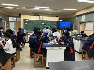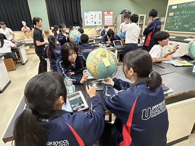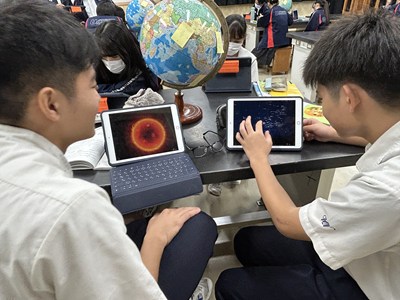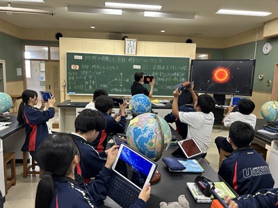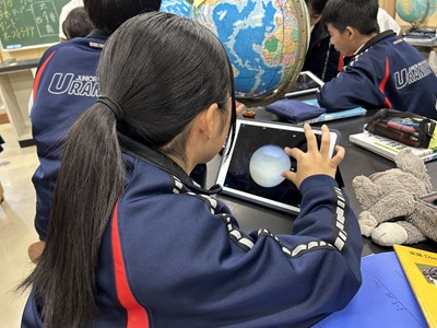 理科室から楽しそうな声が聞こえてきたのでのぞいてみました。3年5組さんが地球儀をグルグルとまわしていました。タブレットにある星座表というアプリを使って、画面を向けた位置にある星を確認できたり、時間を動かして過去や未来の星空をながめたりすることもできます。一人一人が小さなプラネタリウムを持っています。