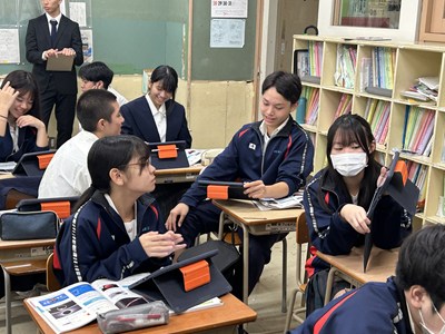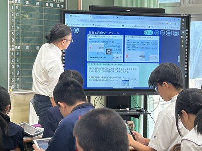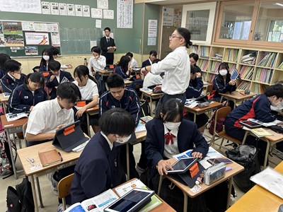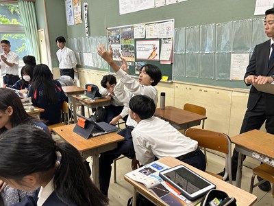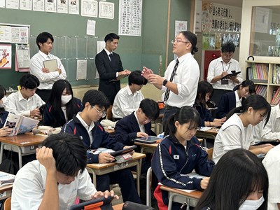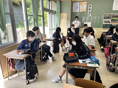 本日2校時、3年3組で南武志先生の研究授業が行われました。日食や月食はどのように起こるのだろうか?という問いに向かって、ペアワークで解決していきます。説明し合うとなるとあちこちで手を使って位置関係を示すなど一生懸命な姿がありました。太陽と地球と月の大きさがどれだけ異なるかが示され南先生から問い返しがあると、生徒から「遠近法」という言葉が出てきました。日食や月食がめったに起こらない理由についてもみんなで考えていきました。理解できたことは実際にアウトプットして確かめることが大切ですね。