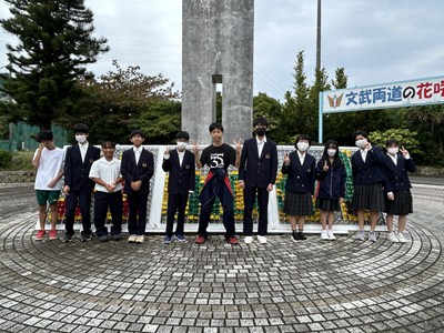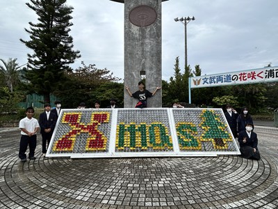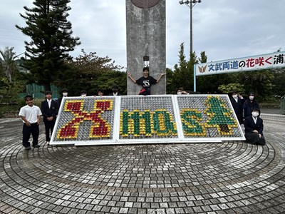 正門の花文字がクリスマス仕様に飾られました!私たちが頑張りました!の記念撮影です。浦西中から「メリークリスマス!」