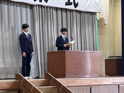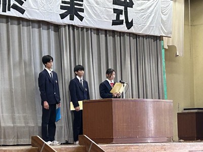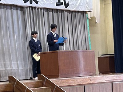 本日5校時に2学期の終業式を行いました。新旧生徒会が協力して式の進行を支えたこと、2年生の集合整列が素晴らしかったこと、全体での校歌斉唱の声が大きかったことはとても評価できる点です。各学年の代表者が、2学期を振り返って自身の反省点や成長した点について、また学年としての次へのステップを見据えた素晴らしいあいさつをしてくれました。新年1月5日の始業式に再会できるのを楽しみにしています!
