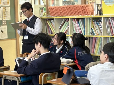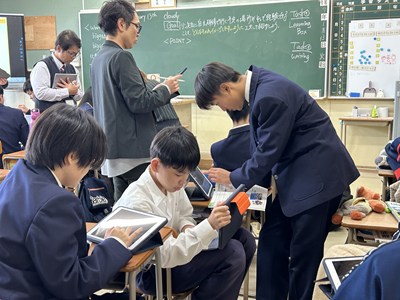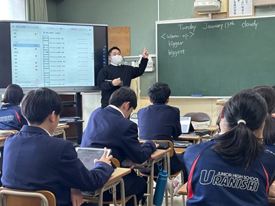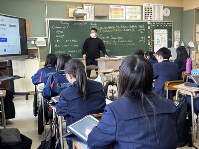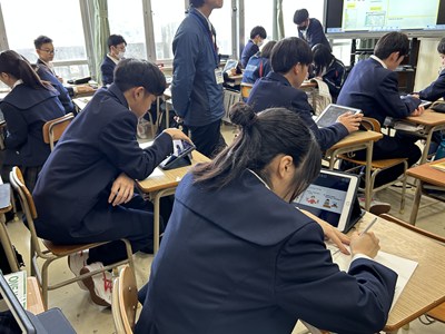 ICTエバンジェリスト颯太先生の英語の研究授業が2年2組で行われました。修学旅行の自主研修で訪れる長崎の名所などを比較級や最上級を用いて紹介するという内容でした。何と比べればより伝わるか、イメージしやすいよう表現の工夫をこらしている様子がうかがえました。