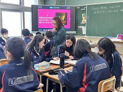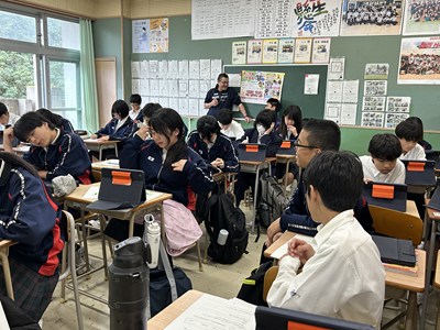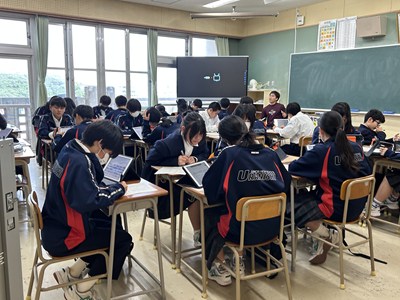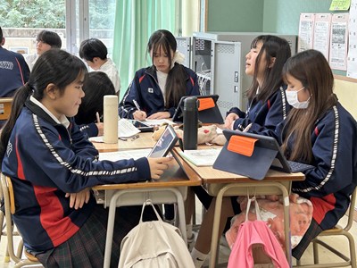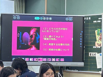 学級活動(3)1年生は将来の夢や職業について考える時間でした。希望の生活を送るために、自分が大切にしたい働き方ってどんなだろう?と話し合ったりタブレットで調べたり、いろいろな職種を比較しながら、考えていました。