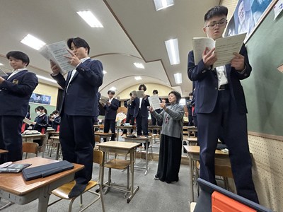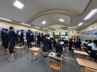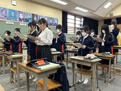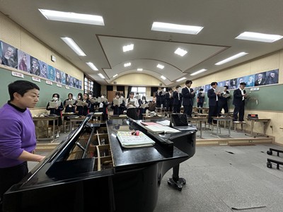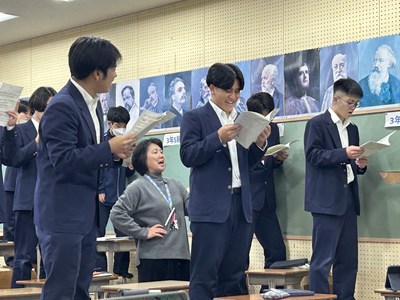 とてもきれいな歌声が響いてきたので音楽の授業を見に行きました。3年5組が卒業式の合唱の練習をしていました。亜紀先生と一緒に中文連の由紀先生もアドバイスしてくれました。この仲間と一緒に迎える感動いっぱいの卒業式が目に浮かびました。