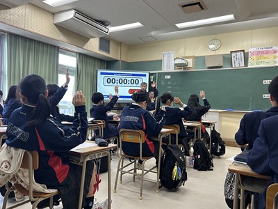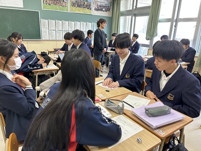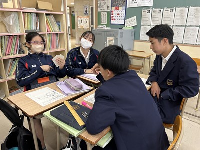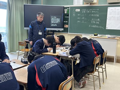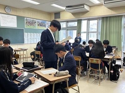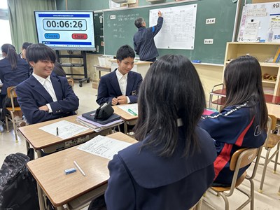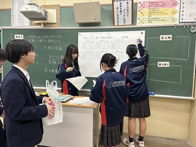 今日は2年5組で渡慶次先生の数学の研究授業が行われました。事前課題で「くじをひくなら先にひく?後にひく?」に回答していた5組さんは断然「あとにひく」派でした。グループになって3枚のカードから1枚のあたりをひく実験をすると、とても仲の良い5組の皆さんは盛り上がり相対度数を計算していました。何番目があたりやすいのか、この後の授業ではさらに根拠をもとに説明できるようになるといいですね。