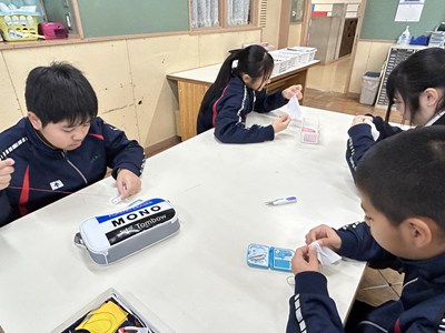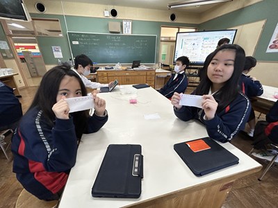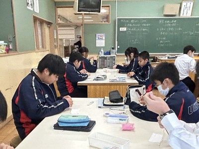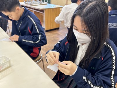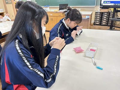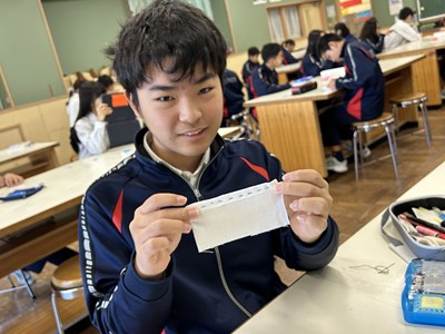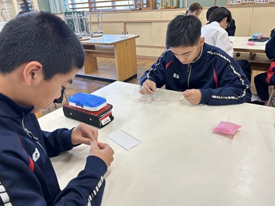 家庭科の時間に「衣服の手入れ」を学んでいる1年生が手縫いの実習を行っていました。小学校の時にも学習した玉結び、並縫い、玉留めの復習と、今回はまつり縫いを学びます。動画で確認しながら一生懸命取り組んでいました。手元に集中する時間も大切ですね!きれいにできて嬉しそうでした。