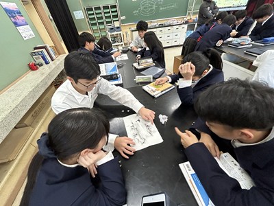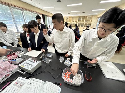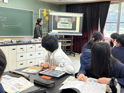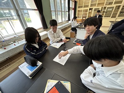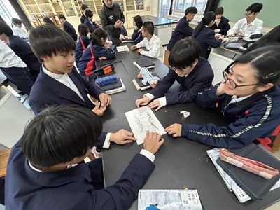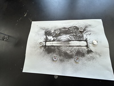 公開日 2026年02月12日 理科室で2年2組さんが磁界の向きを調べる実験を行っていました。棒磁石の上に置いた白い紙に鉄粉をまいて、紙をトントンと優しくたたくと模様が少しずつ出てきます。小さな方位磁針で磁界の様子がわかりました。