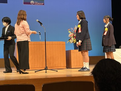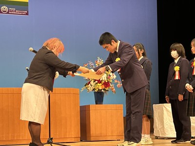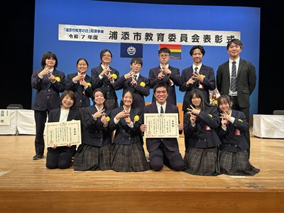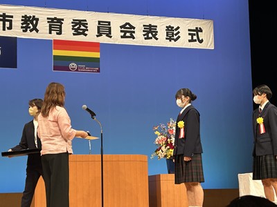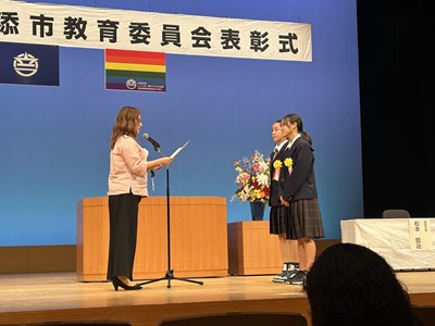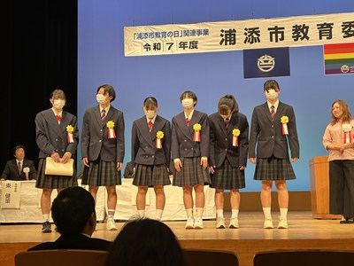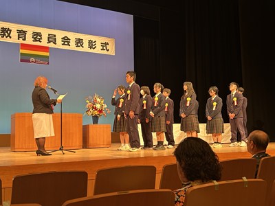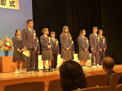 14日土曜日に、令和7年度の浦添市教育委員会表彰式がアイム・ユニバースてだこホールにて行われました。善行の部団体で、本校生徒会総務の皆さん、美績部門団体で、浦西中生徒が所属するアスリート工房、FC琉球さくらale U-15、G-style、の皆さんがそれぞれ表彰されました。また、学校教育功労賞に川上真紀子先生、団体として浦西中学校が表彰されました。大変喜ばしいことです。受賞した皆さん、おめでとうございます。