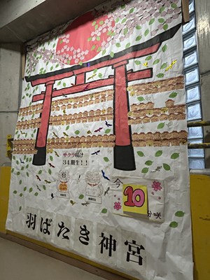 公開日 2026年02月18日 羽ばたき神宮の桜が10分咲きになりました。全校生徒、全職員で3年生の背中を押してあげられるよう、メッセージを書きました。生徒会の皆さんを中心に、放課後少しずつ完成させて、今日満開です!頑張れ!受験生!