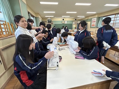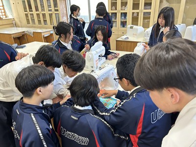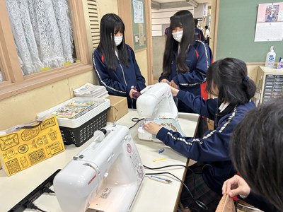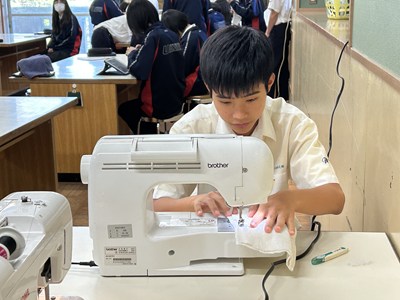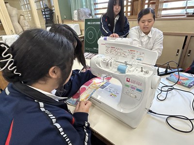 1年1組さんがミシンで布巾を縫っていました。こんなに注目されていては縫いにくいかな?とも思いましたが、順番を待ちながら楽しそうです。しっかりと返し縫いもしています。自分でリサイクルして作ったものを使うことはすごくよいことです。大掃除シーズンに活躍するといいですね!