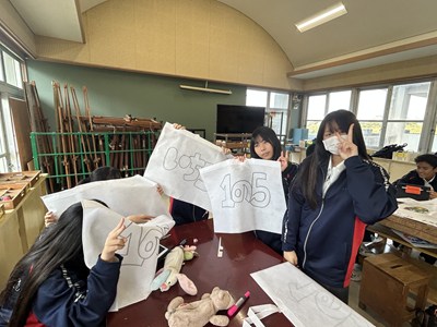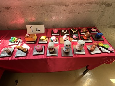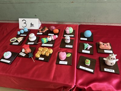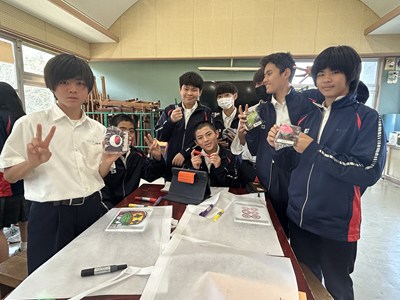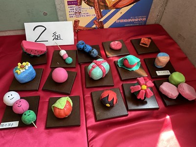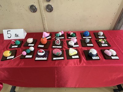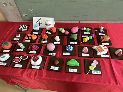 美術の時間に「和菓子のデザイン」に取り組んだ1年生の作品が展示されていました。美味しそうだったのでご紹介します。食品サンプルでも使用されている紙粘土で作られているそうです。一人一人のこだわりが感じられて楽しい授業だったことでしょう。1年5組さんは最後の美術の授業で持ち帰り用のバッグにイラストを描いていました。2年生に進級しても思い思いに表現できる美術の時間を楽しんでくださいね!