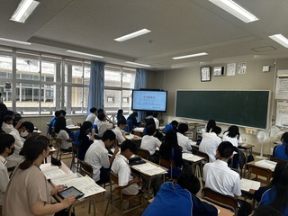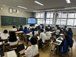 前半は教室でオンデマンドによる議案の確認、後半は議案の決議を体育館で行いました。前半の教室では、前年度の活動報告や決算報告、今年度の活動計画と予算案を生徒会執行委員会がわかりやすくプレゼン動画でまとめており、浦添中学校の生徒会の活動をしっかりと確認することできました。クラスミーティングで決まったあいさつの取り組みの動画では各クラスのカラーが色濃くでていました。