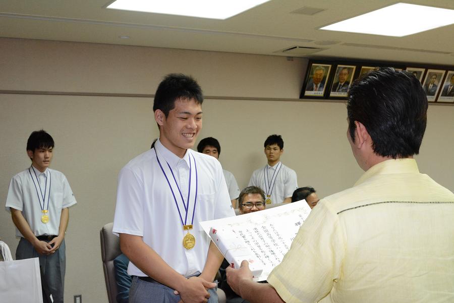 に、賞状と副賞(てだこ織ペンケース)を贈らせて頂きました。